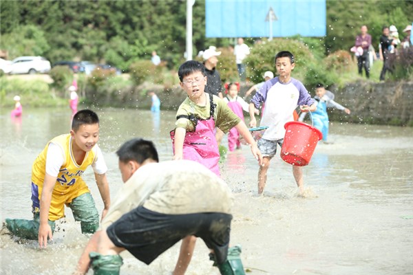 三山村萬畝梯田依山勢層疊而上,春天水光瀲滟如鏡,夏日稻浪翻滾似錦,是皖南丘陵地區農耕文明的鮮活印記。本次活動緊扣“田園、生態、鄉情”主題,創新設計四大體驗場景。游客們既能渾水摸魚尋野趣,卷起褲腿踏入生態水田,親子協作捕捉稻田魚蝦,感受傳統農耕智慧;又能在梯田插秧賽技藝,化身“現代農夫”,參與插秧競技,優勝者可獲梯田稻米豐收季專屬禮遇;還能清溪垂釣品山韻,在山澗溪畔執竿靜候,收獲的鮮魚可現場烹制為特色農家菜。