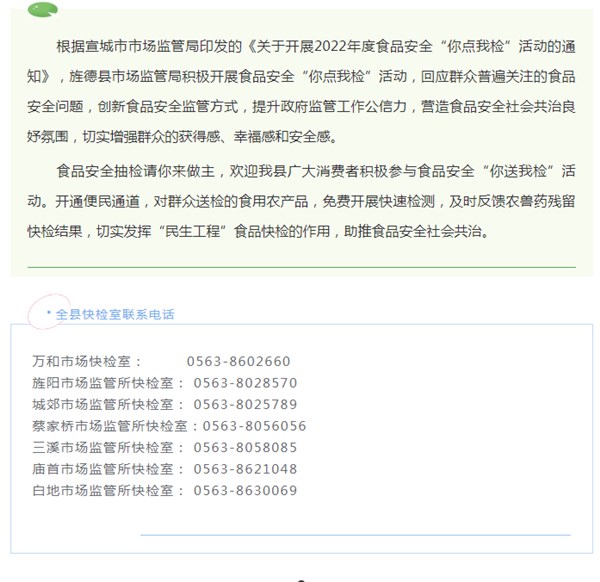 旌德縣2022年度食品安全“你點我檢”活動快檢室聯系方式
