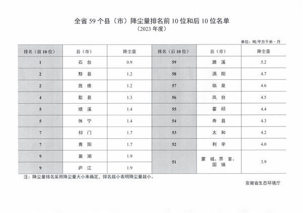 全省59個縣(市)降塵量排名前10位和后10位名單(2023年度)