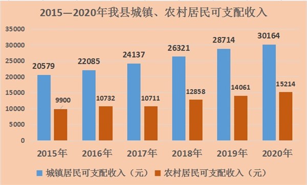 2015—2020年我縣城鎮、農村居民可支配收入
