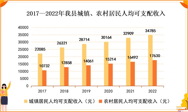 2017—2022年我縣城鎮、農村居民人均可支配收入