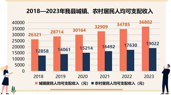 2018—2023年我縣城鎮、農村居民人均可支配收入