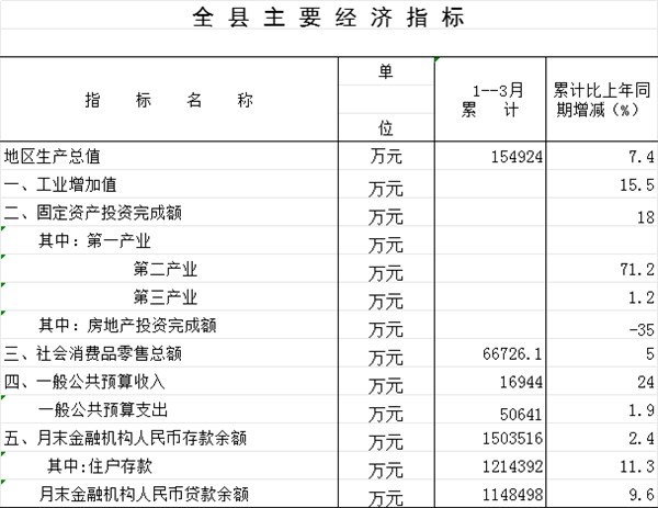 根據地區生產總值統一核算結果,一季度全縣地區生產總值15.5億元,按可比價格計算,同比增長7.4%,增速居全市第一。其中,第一產業增加值0.9億元,同比增長4.2%;第二產業增加值6.7億元,同比增長13.2%;第三產業增加值7.9億元,同比增長3.2%。主要特點有五個方面: