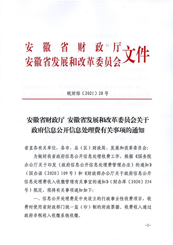 安徽省財政廳安徽省發(fā)展和改革委員會關(guān)于政府信息公開信息處理費有關(guān)事項的通知